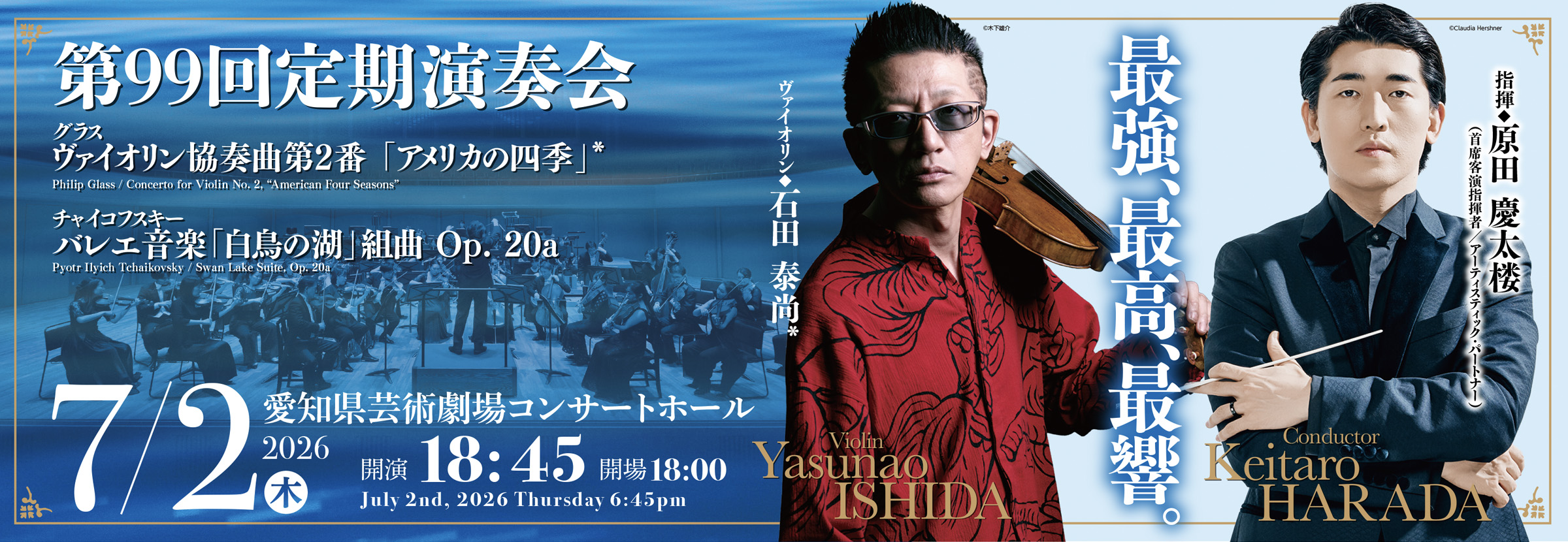 首席客演指揮者兼アーティスティック・パートナーの原田慶太楼がユニークなプログラムを組んでくれた。ミニマル・ミュージックのレジェンドである現代アメリカの作曲家フィリップ・グラスのヴァイオリン協奏曲第2番「アメリカの四季」と、チャイコフスキーのバレエ音楽「白鳥の湖」組曲。かなり意外性のある組合せだ。両者の世界観はまったく異なる。グラスの「アメリカの四季」の不思議なところは、4つの楽章があるにもかかわらず、どの楽章にも春夏秋冬の題がついていないところ。同じヴァイオリン協奏曲でありながら、ヴィヴァルディの描写的な「四季」とはかけ離れた、現代の大都市の希薄な季節感の反映とでもいうべきか。ソロは石田泰尚。鮮烈なソロを披露してくれることだろう。チャイコフスキーの「白鳥の湖」組曲は、有名な「情景」や「白鳥たちの踊り」など名曲の宝庫。原田慶太楼が心揺さぶる音のドラマを描き出す。